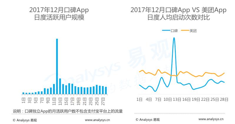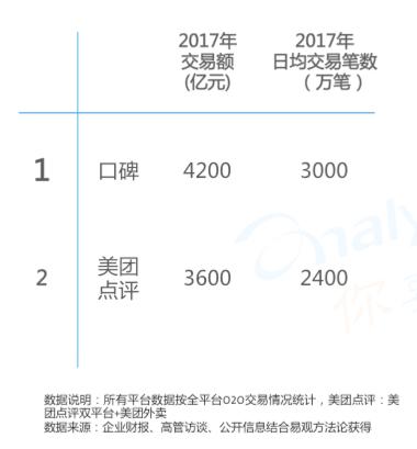 根據(jù)易觀報(bào)告監(jiān)測的數(shù)據(jù),2017年全年,口碑的GMV在4200億元左右,較去年同期增長142.6%。本月,美團(tuán)點(diǎn)評(píng)CEO王興也曾對外透露了美團(tuán)業(yè)績數(shù)據(jù)。2017年,美團(tuán)點(diǎn)評(píng)交易額達(dá)到3600億元,比2016年同期增長了50%。以日交易筆數(shù)排名,口碑的日交易筆數(shù)突破3000萬筆,超越美團(tuán)點(diǎn)評(píng)的2400萬筆。在GMV和日交易筆數(shù)這兩個(gè)關(guān)鍵指標(biāo)上,口碑均位列行業(yè)第一。