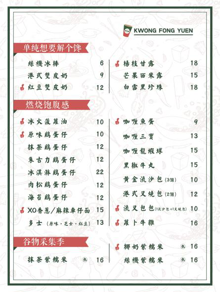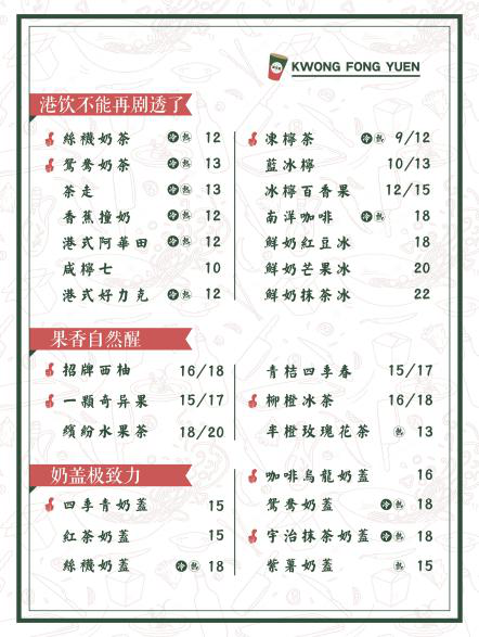 從廣芳園的菜牌來(lái)看,分類就較為明確。作為茶飲+小食的品牌,在食和飲的方面做出了明確的區(qū)分。同時(shí),在飲品方面,又著重進(jìn)行了細(xì)分:以港飲、奶蓋、果香、谷物幾個(gè)分類,很容易讓顧客做出偏好選擇。