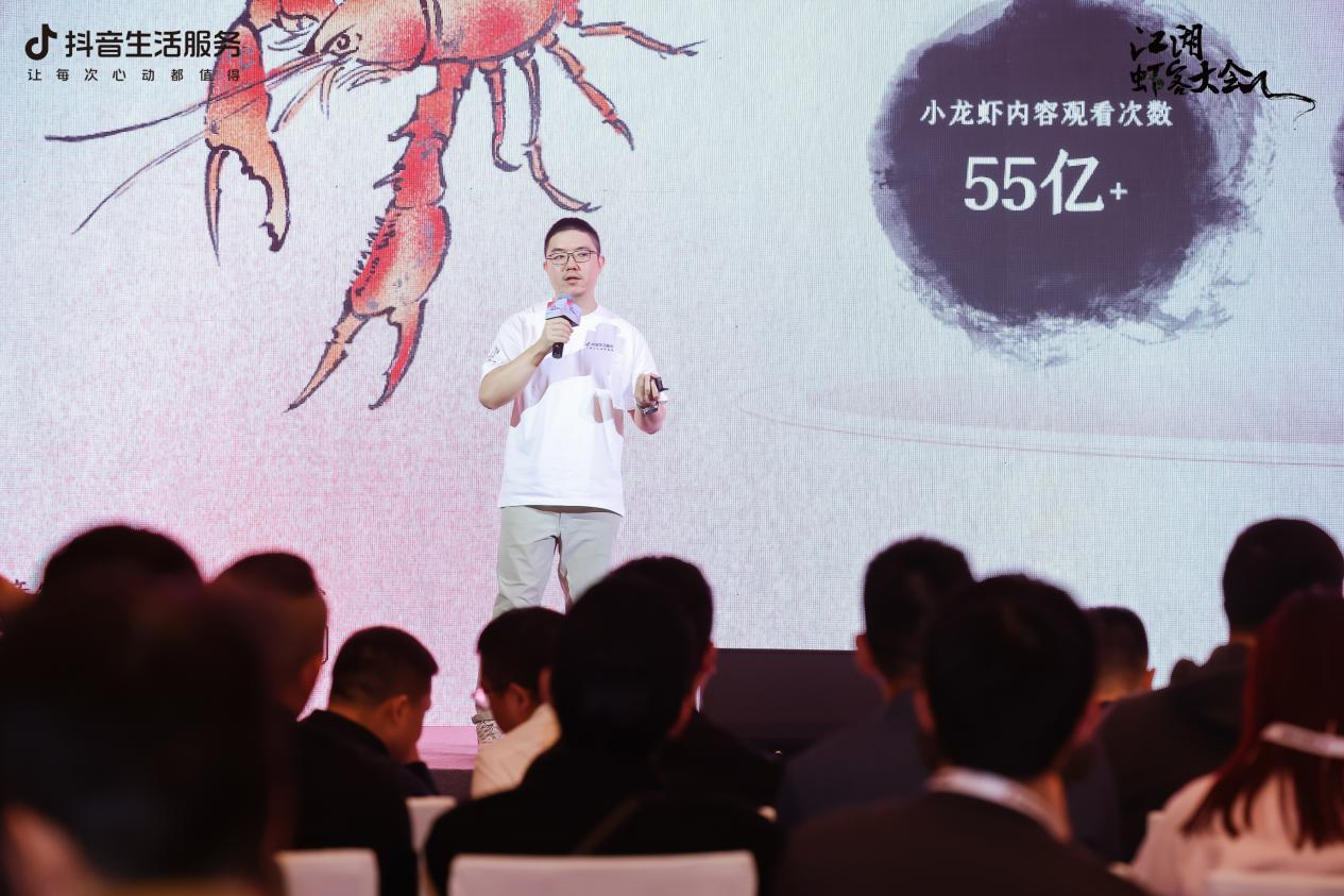 作為特色菜與地方菜的重要菜品,小龍蝦引發(fā)全民追捧,龍蝦季成為狂歡盛宴。抖音生活服務(wù)餐飲行業(yè)南區(qū)市場策劃總監(jiān)王杰夫通過多維數(shù)據(jù),展示小龍蝦的火爆程度。近一年來,抖音上小龍蝦相關(guān)內(nèi)容視頻量超90萬,觀看次數(shù)已超過55億,小龍蝦內(nèi)容創(chuàng)作者超27萬,小龍蝦內(nèi)容互動(dòng)量超8900萬。