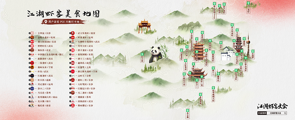 基于巨量引擎城市研究院的用戶喜愛POI興趣打卡地,在峰會(huì)現(xiàn)場,抖音生活服務(wù)針對小龍蝦品類重磅發(fā)布了江湖蝦客美食地圖,囊括了各地的小龍蝦推薦品牌,一張圖帶領(lǐng)蝦客打卡全國。