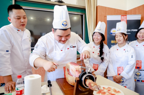 6月21日,烹飪專業(yè)多名學(xué)生參加了"歐洲豬肉,'品智'之選"大師班活動。大師班授課采用理論和實(shí)踐相結(jié)合的方式。在理論課上,結(jié)合歐洲豬肉生產(chǎn)加工管理體系,介紹了歐洲在豬肉生產(chǎn)方面實(shí)現(xiàn)安全、質(zhì)量、動物福利以及可持續(xù)性的經(jīng)驗(yàn)。在系統(tǒng)學(xué)習(xí)理論知識后,學(xué)員們分為兩組,以歐洲豬肉為主要食材,體驗(yàn)了中餐烹飪、西餐烹飪和歐洲火腿切割等實(shí)操內(nèi)容。在資深老師的指點(diǎn)下,醬爆松仁歐洲五花肉、烤歐洲豬肋排,一盤盤精致美味、香氣撲鼻的歐洲豬肉菜品,在同學(xué)們的手中精彩呈現(xiàn)。歐洲豬肉的鮮嫩多汁得到了大家的交口稱贊。