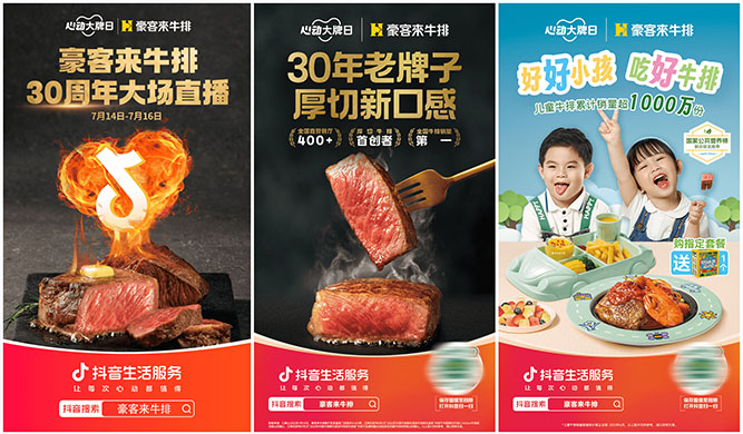 而具體到玩法維度,深度聯(lián)動抖音生活服務(wù)「心動大牌日」,在30周年之際,將豪客來產(chǎn)品“厚”的優(yōu)勢延續(xù)其中,“厚”代表的“好”寓意,“OK”手勢玩法正好呼應(yīng)“30”數(shù)字,借力平臺玩法優(yōu)勢,成功打造品牌大事件,再一次“玩出”了自己的創(chuàng)新答案,實現(xiàn)“上新產(chǎn)品即爆品”和“品牌實力印象深植”的品效合一收獲。無論是線上線下導(dǎo)流聯(lián)動傳播周年慶新品,創(chuàng)作有特色的魔性rap歌曲“洗腦”平臺受眾,打造OK手勢舞挑戰(zhàn)賽等組合玩法,精準(zhǔn)對標(biāo)用戶興趣點,吸引目標(biāo)客群的關(guān)注互動;還是以BIG DAY的大場直播承接前置流量,打爆周年慶新品高轉(zhuǎn)化;依托抖音生活服務(wù)平臺的流量玩法載體,豪客來牛排成功收獲千萬GMV增長,也從黃金厚切火焰黑椒牛排的強勢種草回歸到“厚切牛排首創(chuàng)者”的品牌心智傳達,蓄力品牌的長效熱度增長。