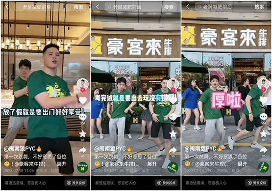 與此同時,抖音生活服務(wù)平臺豐富的達人資源,給足了豪客來牛排實現(xiàn)創(chuàng)意、輸出優(yōu)質(zhì)內(nèi)容的空間?;凇感膭哟笈迫铡惯^往的成功運營經(jīng)驗,豪客來牛排制定了“超頭達人+才藝類達人矩陣+團購類達人”的達人短視頻鋪排策略。這樣一來,既有熱點的引爆,也有平臺面上的覆蓋,更有生意經(jīng)營量上的轉(zhuǎn)化。