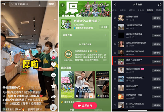 當(dāng)@閩南狼PYC 的短視頻在平臺引爆后,借助「心動大牌日」傳播勢能,豪客來牛排聯(lián)合@猛男舞團 發(fā)起#被這個OK舞洗腦了 話題挑戰(zhàn)賽,趣味好玩的舞蹈內(nèi)容點燃平臺多類人群的參與熱情。以洗腦、有趣的短視頻內(nèi)容,完成品牌與其他西餐牛排品牌的辨識區(qū)隔。視頻內(nèi)容以魔性rap洗腦歌曲為BGM,搭配高顏值達人的不同風(fēng)格演繹,強力激發(fā)出用戶參與挑戰(zhàn)賽的興趣,獲得數(shù)量眾多的挑戰(zhàn)賽投稿內(nèi)容,UGC在平臺不斷發(fā)酵,形成裂變傳播和廣泛的用戶觸達,在用戶的主動互動中潛移默化地培養(yǎng)其品牌認知。最終#被這個OK舞洗腦了 話題挑戰(zhàn)賽在平臺獲得2.2億的曝光量,最高登上全國熱榜第25位,豪客來牛排借此成功提高了周年慶活動及新品黃金厚切火焰黑椒牛排在平臺的曝光量,為直播充分蓄水。