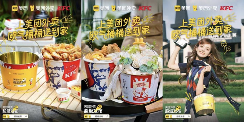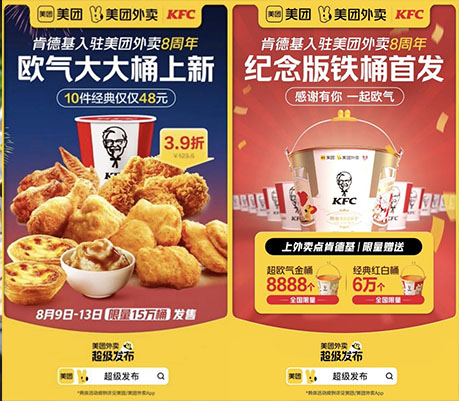 首先,在貨品和權(quán)益定制方面,為了有效激發(fā)新老用戶在暑期聚餐場(chǎng)景下對(duì)“分享”屬性餐飲的需求,美團(tuán)外賣“超級(jí)發(fā)布”結(jié)合肯德基“桶”類產(chǎn)品優(yōu)勢(shì),定制了“歐氣大大桶”聯(lián)名新品 ,并圍繞目標(biāo)人群對(duì)低價(jià)深折的需求,將本次新品“歐氣大大桶”的價(jià)格設(shè)定為3.9折優(yōu)惠,強(qiáng)化“周年慶”大促利益點(diǎn)的同時(shí)實(shí)現(xiàn)了拉新提頻的營(yíng)銷目標(biāo)。