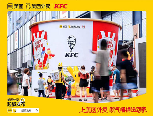 此外,美團(tuán)外賣“超級(jí)發(fā)布”也為肯德基提供了傳播策略方案,通過線下打造“最大全家桶”熱搜事件,在上海五角場(chǎng)萬達(dá)人流量密集地搭建肯德基“歐氣大大桶”,為肯德基打造“有趣年輕”的品牌形象,吸引大量年輕用戶線下打卡線上種草,為更多消費(fèi)者們建立全新的品牌認(rèn)知,幫助品牌再度夯實(shí)年輕化心智。熱搜事件成功在微博平臺(tái)獲得2億+曝光量及20w+互動(dòng)量,有效引起了老客群體的高度關(guān)注和用戶的自傳播。