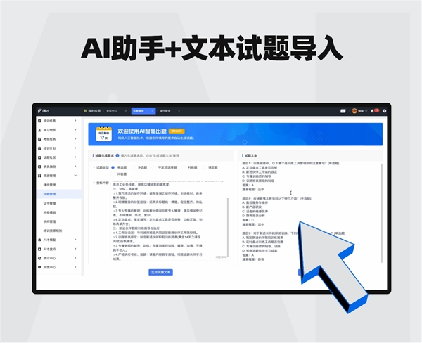 沃才3.0版本通過運用先進的人工智能技術,推出了AI助手和文本試題導入功能,幫助企業(yè)一鍵研發(fā)考題及輕松創(chuàng)建在線考試。在使用中,只需將內部培訓資料文本粘貼輸入,僅幾秒鐘,AI助手就可以根據資料內容自動生成完整試題,生成后試題可在平臺中直接引用到考試場景。這極大地節(jié)省了企業(yè)培訓人員在出考題和上傳試題的時間,讓培訓工作效率更卓越。