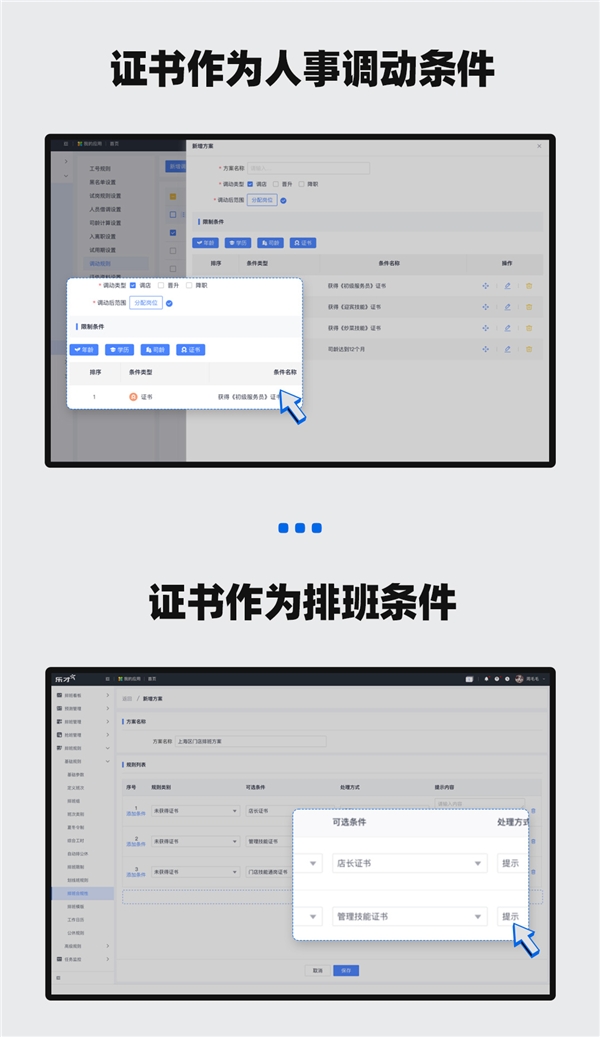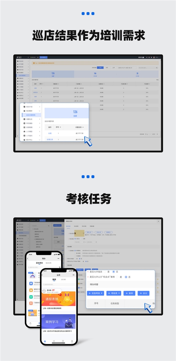 在解決方案一體化上,我們通過實現證書作為員工的人事調動及日常排班條件,巡店結果作為培訓需求依據,考核任務作為門店監(jiān)管及店長運營助手,從而提升了人事審批及排班流程的效率,解決了信息孤島問題,并且?guī)椭髽I(yè)精準定位門店管理存在的不足之處,以此來制定有效的培訓計劃。