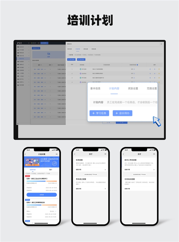 沃才3.0在流程自動化的實現上,我們推出了“培訓計劃”功能。它可以將多個學習任務或店長待辦組成一個任務鏈,員工完成上一個任務后會自動觸發(fā)下一個任務,按規(guī)劃學習,用考試檢核;訓練員/師父/管理者可實時關注,線上線下進度一致,實現了多種培訓場景的流程自動化。
