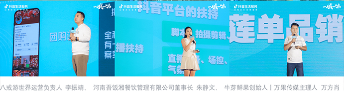 活動(dòng)現(xiàn)場(chǎng),三位品牌代表的干活分享和技能點(diǎn)拉滿收獲陣陣掌聲。作為商家,更需要具備的是了解達(dá)人市場(chǎng),找到好的達(dá)人,用好達(dá)人。八戒游世界運(yùn)營(yíng)負(fù)責(zé)人李振靖代表服務(wù)商現(xiàn)身說法商家如何在抖音生活服務(wù)業(yè)務(wù)生態(tài)體系中,借力達(dá)人實(shí)現(xiàn)品效合一,提升GMV。河南吾飯湘餐飲管理有限公司董事長(zhǎng)朱靜文從打造個(gè)人IP,從內(nèi)容破圈,放大餐飲新能量。牛芽鮮果創(chuàng)始人丨萬果傳媒主理人萬方肖分享了一家鮮果店從0-1的抖音經(jīng)營(yíng)之旅,深挖線上陣地建設(shè)過程中的困難、經(jīng)驗(yàn)、思考,為更多同行提供實(shí)戰(zhàn)經(jīng)驗(yàn)。