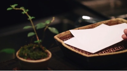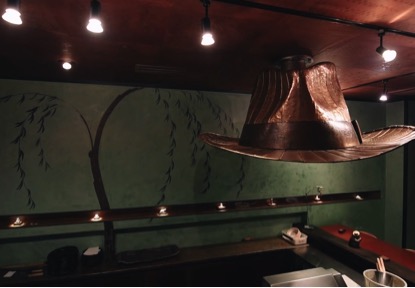 早乙女在17歲時決定把制作天婦羅當(dāng)做一生的事業(yè),他幻想室內(nèi)的裝飾要讓很多藝術(shù)家來做,自己也要像藝術(shù)家一樣去炸制天婦羅。而今天,是山居的店內(nèi)裝潢充滿了藝術(shù)感。進(jìn)店掀開紗簾后,可以看到一條并不算長的走廊,光線不強(qiáng)烈,深色調(diào),墻上和柜子上有很多藝術(shù)品,有些是早乙女自己畫的墻畫,也有前田正博、山上亮、上田哲也等人的陶藝作品。從壁紙到壁燈再到起到掩映作用的綠植都好像是渾然一體。盛放剛出鍋食物的餐碟旁有一盆小小的綠色植物,并不茂盛,客人面前還有成套的進(jìn)食餐具,同圍坐的吧臺一樣,這些東西都是古色古香的氣息。