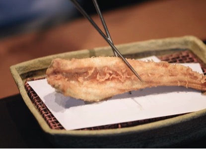 他制作的天婦羅魚仿佛前一秒還在游動,但游著游著就變成了食物,從油鍋中撈出,擺在了考究的餐碟上。這個餐碟其實(shí)是你面前的一個小竹籃,鋪著一層吸油紙,早乙女會用長長的筷子把剛剛炸好的天婦羅夾到上面,有的會從中間一分為二,有的平行著擺上兩只。金黃色的天婦羅看上去很誘人,能讓人拋卻節(jié)食的想法。