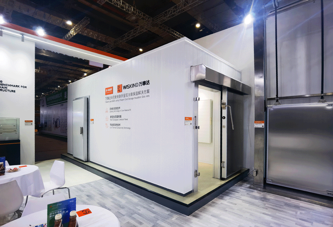 本次展會(huì)中,給大家?guī)?lái)了一款新一代聚氨酯冷庫(kù)板——麗彩晶?聚氨酯冷庫(kù)板,該產(chǎn)品是萬(wàn)事達(dá)與巴斯夫共同打造,專(zhuān)門(mén)為應(yīng)對(duì)食品加工、冷鏈物流等行業(yè)痛點(diǎn)而研發(fā)的最新產(chǎn)品。同時(shí),其展出的冷庫(kù)樣板房、聚氨酯隱釘外墻板、冷庫(kù)保溫門(mén)等系列產(chǎn)品,吸引了大量游客駐足參觀。
