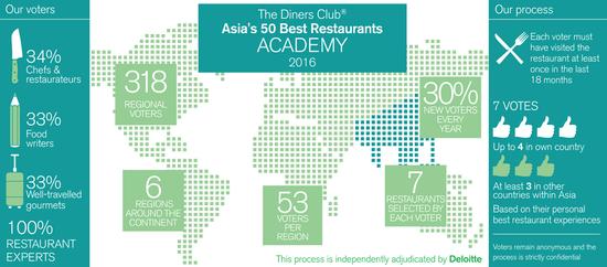 據悉,50最佳餐廳評選最初始于2002年的全球50最佳餐廳評選,后經同一主辦方籌劃,于2013年起開辦亞洲榜,今年是第四次評選。和全球榜評選機制相同,亞洲50最佳餐廳排行榜由318位亞洲美食專家投票產生,且這300多位評審將保持每年30%的更新率。主辦方稱,入圍餐廳不一定要符合某種標準,在開業(yè)時間、菜品上沒有具體要求,只要在投票期間開門營業(yè),并且公布榜單后短時間不關張就行,能不能評上全憑好味道。