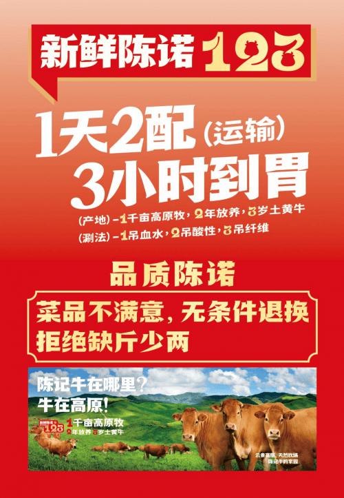 品牌要跑得快,后端供應(yīng)鏈必須跟得上。陳記順和成熟的供應(yīng)鏈體系和標(biāo)準(zhǔn)化管理,從活牛運(yùn)輸?shù)酵涝椎脚渌偷讲妥佬纬砷]環(huán)。每天 2-3 次的新鮮配送,牛肉 3 小時送達(dá)餐桌,不僅保留了肉質(zhì)的鮮美,讓顧客能夠享受更新鮮的食材體驗,同時也讓品牌擁有議價的主動權(quán),建立自己的護(hù)城河。