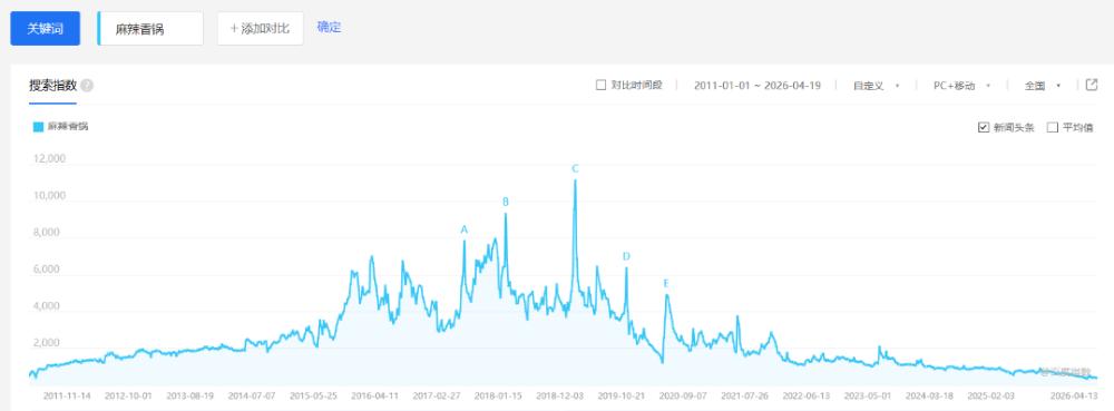 麻辣香鍋是緊跟水煮魚之后走紅的“重口味”代表。憑借現(xiàn)炒模式和自選搭配,麻辣香鍋在快餐與正餐之間劈開了一條路。2015年前后,麻辣香鍋幾乎成為各類商圈的標(biāo)配,2018年前后,麻辣香鍋的流量達(dá)到頂峰。但近兩年,當(dāng)“價(jià)格刺客”成為這個(gè)品類的新標(biāo)簽,麻辣香鍋專門店聲量大不如前。