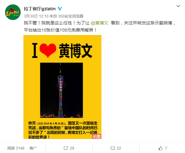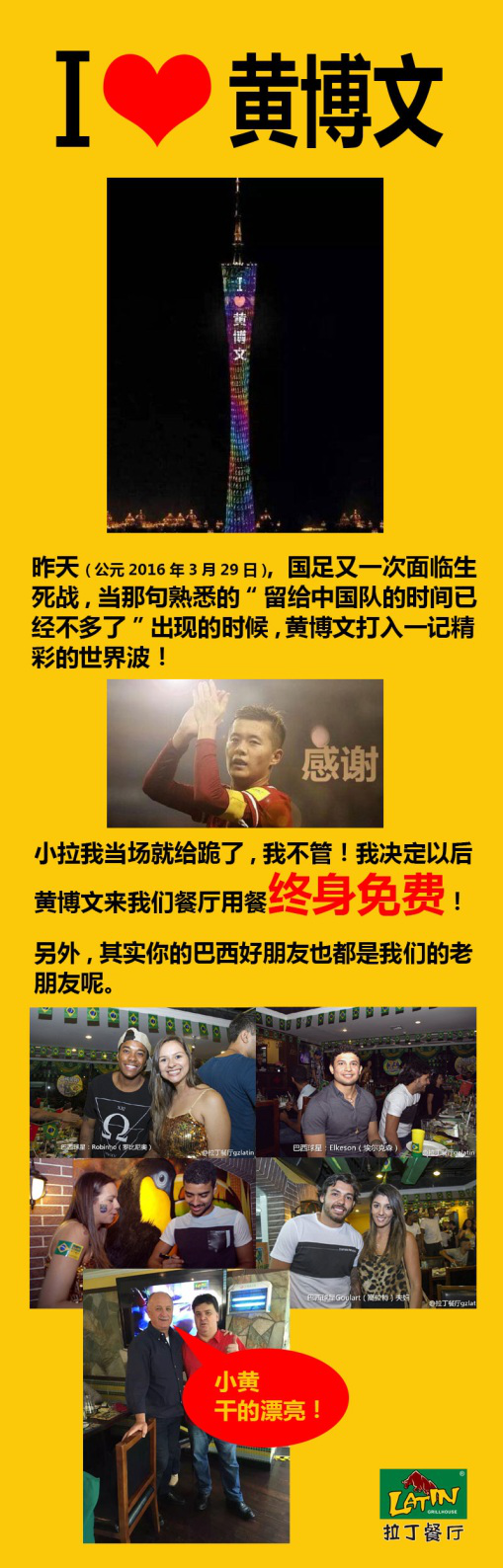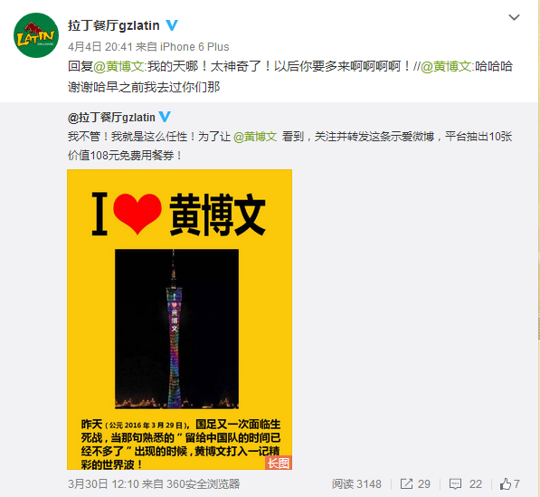 329日,中國(guó)男足在大部分球迷都絕望的時(shí)候成功打入世界杯亞洲區(qū)十二強(qiáng)復(fù)賽,廣州恒大球員黃博文打入關(guān)鍵一球。廣州拉丁餐廳發(fā)布了這樣一條微博: