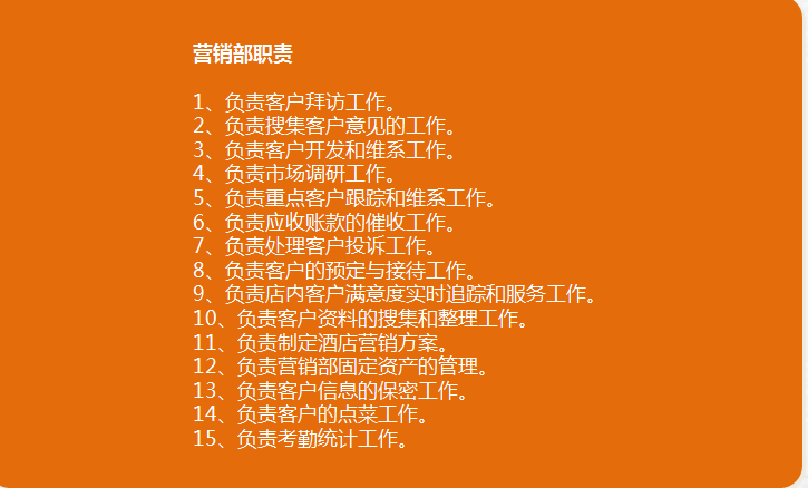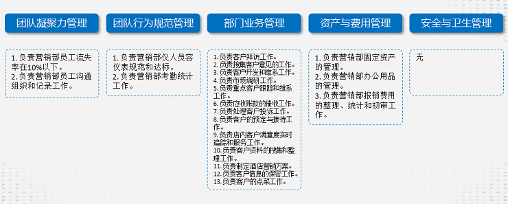 這份職責(zé)表沒有具體指定要由誰來負(fù)責(zé)哪些事情。而一份科學(xué)的部門職責(zé)必須要從多個角度來考慮,首先是團隊建設(shè),包括凝聚力管理和行為規(guī)范管理。只有團隊穩(wěn)定且規(guī)范,才能確保戰(zhàn)斗力。其次是與業(yè)務(wù)相關(guān)的角度,如部門業(yè)務(wù)管理、資產(chǎn)費用管理。在這里要強調(diào)一句,對餐飲行業(yè)來說,食品安全與衛(wèi)生管理也是重頭戲。于是有了下面這一版本的營銷部門職責(zé)表。
