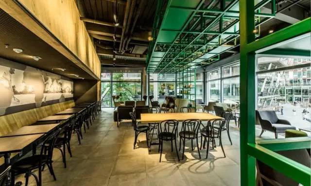 這家星巴克位于德國柏林波茨坦廣場的索尼中心,店鋪分上下兩層。進(jìn)入店內(nèi),最搶眼的莫過于超大型的綠色不銹鋼儲物架,蔓延了整個空間,透出一種清新活力的用餐氛圍。