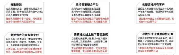 分散的終端給服務員增加了大量的工作。餐廳點菜時需要點菜寶,用微信支付寶等支付時,需要的終端是手機,傳統(tǒng)刷卡支付需要傳統(tǒng) POS 機,服務員往往需要往返多次,耗時耗力。這種情況下,急需要一個整合的平臺,可以實現(xiàn)從點菜到支付的一體化的連接,支付與卡券核實的連接,卡券與營銷工具的連接。整合后的平臺,可以讓服務流程與平臺管理的各種行為順利過度并實現(xiàn)數(shù)據(jù)關聯(lián)。