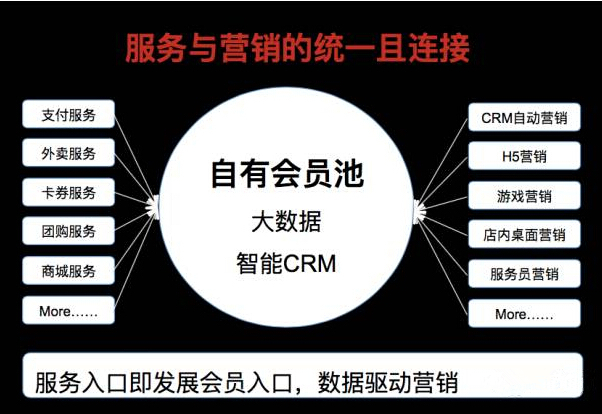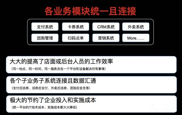 所有系統(tǒng)的商家通過統(tǒng)一平臺,實現(xiàn)打通,從而無縫的覆蓋線上線下所有消費者。比如餐廳的一個消費行為,不管是從外賣平臺過來的,還是從團購中過來的,抑或直接從線下過來的,只要消費,就從同一終端進行解決,然后后臺同一系統(tǒng)進行記錄和跟蹤消費者數(shù)據(jù)。