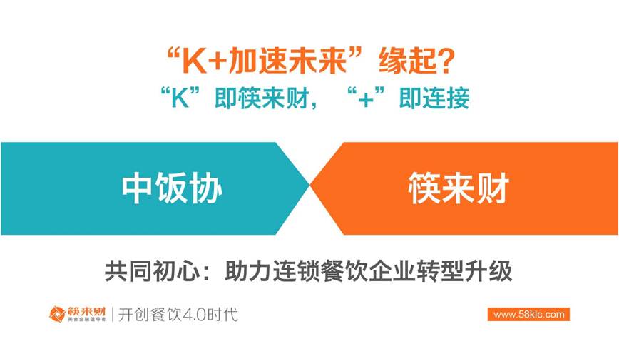 李宏文稱:“K+加速未來”計(jì)劃是應(yīng)時(shí)應(yīng)需而生。所謂“K”即筷來財(cái),“+”即連接。“K+加速未來”計(jì)劃通過中飯協(xié)和筷來財(cái)?shù)暮献?,連接中國餐飲市場上150萬家連鎖餐飲企業(yè),連接200萬+連鎖餐廳,連接600萬家食材供應(yīng)商,連接1000萬+的個(gè)人投資者,充分發(fā)揮中飯協(xié)全國性行業(yè)組織和筷來財(cái)餐飲業(yè)公共服務(wù)基礎(chǔ)設(shè)施的作用,助推餐飲企業(yè)完成升級(jí)轉(zhuǎn)型,促進(jìn)餐飲產(chǎn)業(yè)的可持續(xù)發(fā)展。
