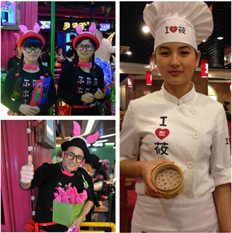 作為餐廳中閃動的元素,店員的服裝也需要自然地融入餐廳環(huán)境,與餐廳風格保持一致,避免不和諧現(xiàn)象。比如西貝店員服飾都是統(tǒng)一的白色,首先給予人潔凈的印象,其次胸前和帽子上顯眼的logo也與餐廳整體紅色基調(diào)相映襯。再看小豬豬烤肉,店里打造的是卡通可愛、粉色萌系的風格,因此,店員的服裝、頭飾等都密切地迎合了“粉豬”色彩,為客人提供服務(wù)時也相當吸睛。