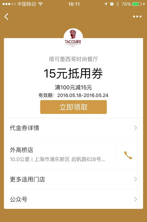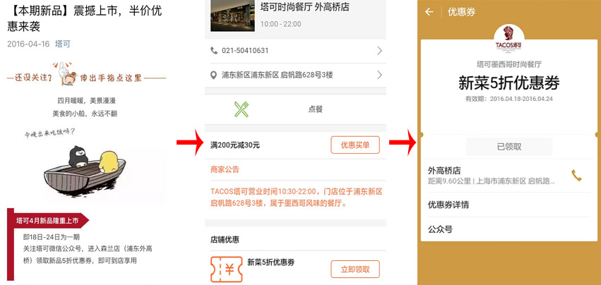 塔可在微信后臺(tái)內(nèi)投放了1000張15元代金券(消費(fèi)滿100元即可使用)。首次關(guān)注公眾號(hào)便可領(lǐng)取。半個(gè)月內(nèi)共被領(lǐng)取了 700張,領(lǐng)取率達(dá)70%。