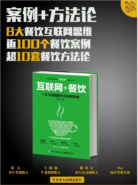 據(jù)了解,《“互聯(lián)網(wǎng)+餐飲”:一本書讀懂餐飲互聯(lián)網(wǎng)思維》一書由“餐飲界”新媒體創(chuàng)始人鶴九所著。該書從實(shí)戰(zhàn)性出發(fā),深入淺出地為餐飲人揭開互聯(lián)網(wǎng)神秘莫測(cè)的面紗,不僅從戰(zhàn)略層面,通過案例剖析“跨界思維、產(chǎn)品經(jīng)理思維、大數(shù)據(jù)思維”3大互聯(lián)網(wǎng)思維如何應(yīng)用;還從戰(zhàn)術(shù)層面總結(jié)出了“社群思維、參與感思維、炒作思維、自媒體思維、平臺(tái)思維”5大互聯(lián)網(wǎng)思維模式。