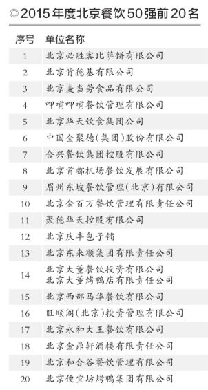 榜單顯示,本次北京餐飲50強(qiáng)品牌中,前三名分別是必勝客、肯德基、麥當(dāng)勞,均為洋品牌。緊隨其后的是呷哺呷哺和北京華天飲食集團(tuán),全聚徳股份則位居第六位。另外,“2015年度北京餐飲十大品牌”也同時公布,包括便宜坊、必勝客、東來順、護(hù)國寺小吃等企業(yè)登榜。2015年,北京餐飲業(yè)全年實現(xiàn)銷售額847億元,扭轉(zhuǎn)了連續(xù)兩年收入下滑的局面,實現(xiàn)了3.3%的正增長。餐飲業(yè)占北京社會消費品零售額的比重達(dá)到8.29%,為促進(jìn)北京消費作出了貢獻(xiàn)?!捌渲衅放撇推笫侵辛黜浦?,在市場中的引領(lǐng)作用更加明顯”,云程表示,譬如在這次評選出的100強(qiáng)餐飲門店中,有95家門店隸屬于50強(qiáng)餐飲企業(yè)(集團(tuán))。