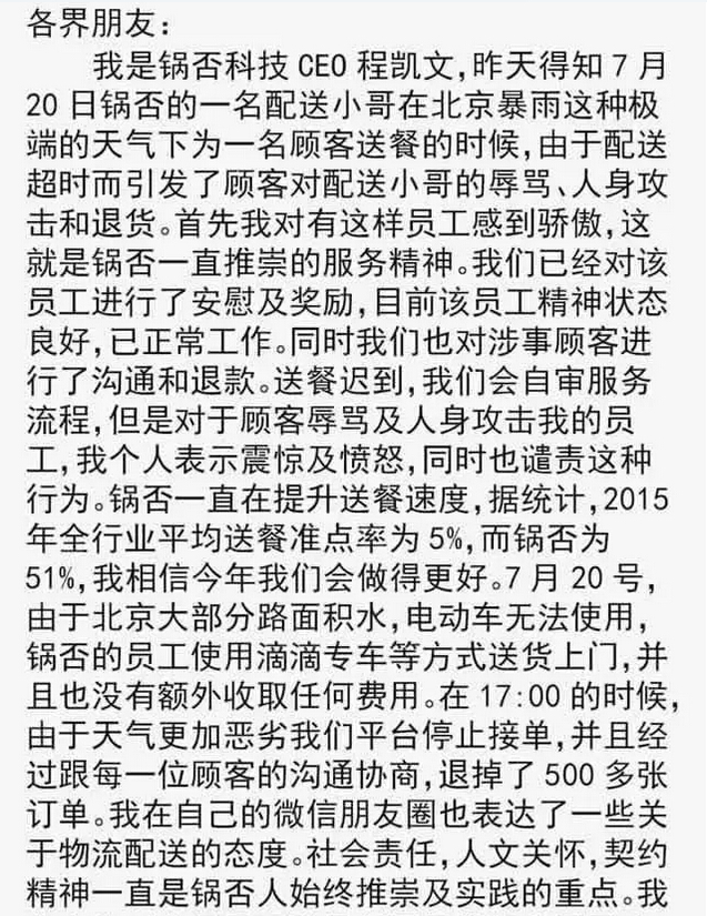 比如7月20日,北京下大暴雨。一家叫鍋否科技主營(yíng)外賣火鍋的企業(yè),處理了這樣一個(gè)“突發(fā)”事件: