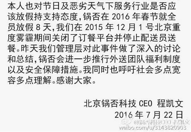 聯(lián)合創(chuàng)始人宋洋也同時(shí)發(fā)聲:“鍋否快遞小哥遲到被罵的事,我們調(diào)查清楚了,按流程對(duì)客人進(jìn)行了遲到賠償,但并沒有對(duì)配送員進(jìn)行處罰,對(duì)昨天所有冒雨工作的配送員,都進(jìn)行了獎(jiǎng)勵(lì)。出于保護(hù)兩位當(dāng)事人的隱私權(quán),希望大家不要再去人肉或者聯(lián)系小哥。最后,我們想呼吁社會(huì),請(qǐng)理解下每天為大家服務(wù)的配送員,他們很辛苦?!?/span>
