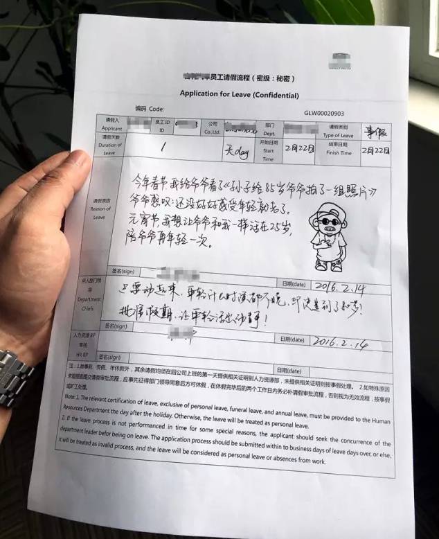“元宵節(jié),我想帶爺爺回到25歲,陪爺爺再年輕一次?!边@是繼“世界這么大我想去看看”“快忘了老公長(zhǎng)啥樣”之后的又一奇葩請(qǐng)假條。然而不可否認(rèn)的是,春節(jié)期間多數(shù)人忙著串親戚、應(yīng)酬朋友,親子間的互動(dòng)少之又少。正因大家都對(duì)此情懷有所共鳴,才使得這張奇葩的請(qǐng)假條獲得領(lǐng)導(dǎo)準(zhǔn)批,以及網(wǎng)友們的贊賞。