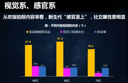 因此可見,在外就餐照片的共享已經(jīng)成為新生代圈子里重要的互動方式之一。90后是追求全方位感官刺激的視覺系群體,而且他們覺得吃飯這個事情就是要和玩到一起去,他們更注重有人情味的和好玩的方式。