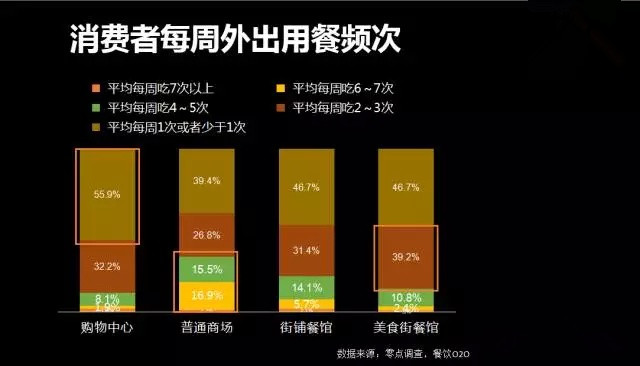 1、56%的每周至少一次去購物中心用餐,說明購物中心是首選,其它場所也有近50%
