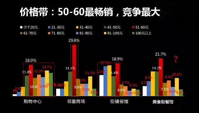 5、美食街的價格帶呈非正態(tài)分布,沒有明顯的定位,各種價格均有不等表現(xiàn),說明依市場選擇來定位,客群不確定。