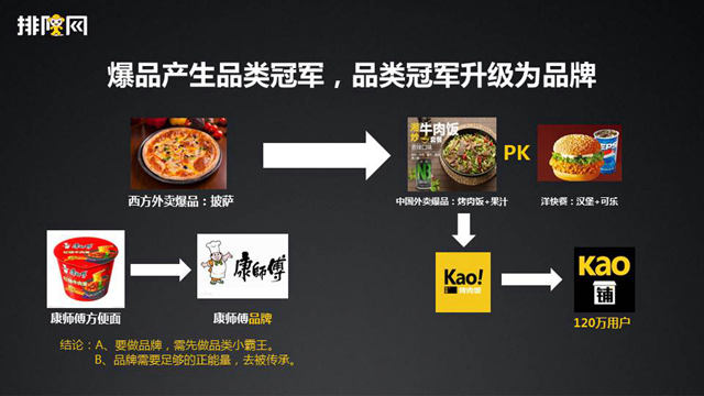 那么在新的階段我猜想可能是壽司。壽司類有可能是下一階段的爆品。當(dāng)然,我是指外賣方面的爆品。為什么這樣講?我們認(rèn)為,爆品能夠產(chǎn)生品類的小霸王。但是品類的小霸王之后會(huì)產(chǎn)生品牌。比如我們熟知的康師傅方便面。人們認(rèn)知它的時(shí)候就是知道康師傅是方便面的小霸王?,F(xiàn)在,康師傅已經(jīng)不僅僅是方便面,還有餅干、水,還有其它一些東西。