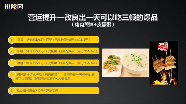 但是,你想想吃一頓烤肉飯呢?那就只能中午去吃了。所以KAO鋪第二階段是主推烤肉煎餃的這一個(gè)爆品,然后不斷去傳播,從而讓我們的用戶量獲取不會(huì)吃虧。