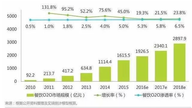 2010-2018年中國(guó)餐飲O2O市場(chǎng)規(guī)模及滲透率)