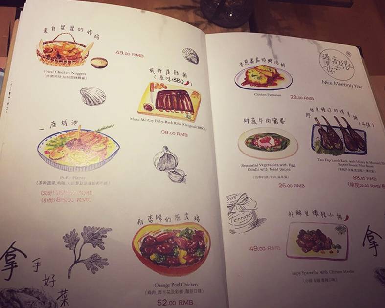“很高興遇見你”用的是手繪菜單,非??蓯郏徊似返拿忠簿o跟潮流,比如“來自星星的炸雞”就是借用了熱播韓劇《來自星星的你》, “一座城池”則引自韓寒寫的書名。