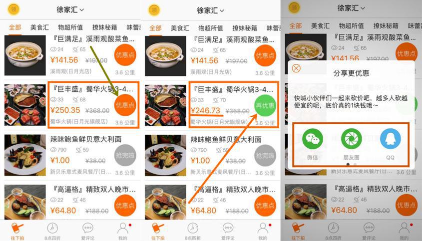 愛搶購有著獨創(chuàng)的砍價模式,用戶可以主動搶購你的商品和服務(wù),點擊一次即可砍價,如果還想要更低,那就要利用微信等社交渠道來傳播、分享,讓更多人參與砍價,無形中形成線上矩陣式擴散,傳播力度更大。