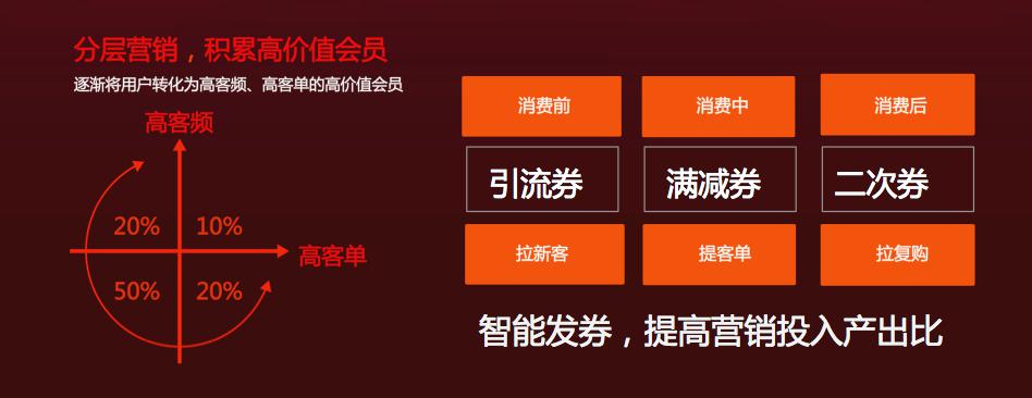 目前,口碑收入月增計劃應用的優(yōu)惠券主要包括新人券、滿減券、二次券以及單品券。根據(jù)口碑團隊的試點經(jīng)驗,當一個商家的移動支付占比超過20%,商家運用收入月增計劃智能發(fā)券達到的提升效果就會非常之明顯。