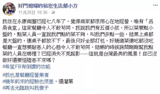 近日,臺灣的某家餐廳就因?yàn)檫@樣被投訴。身家上億的貴婦藝人郁方最近在社交平臺上投訴她附近的餐廳宰客。