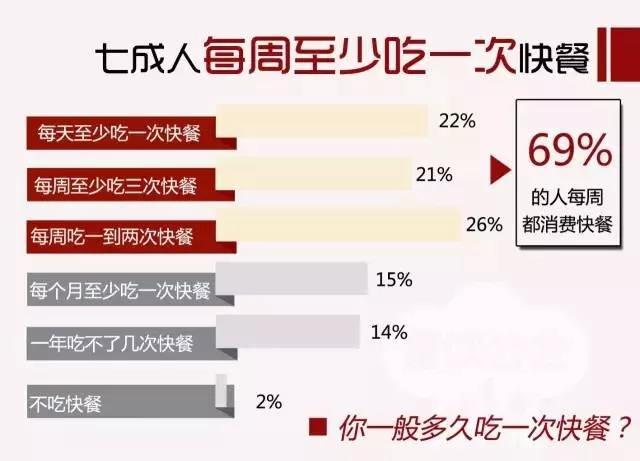 在我們的調查中,有22%的人表示他們每天至少吃一頓快餐,而每周吃三次快餐和每周吃一到兩頓快餐的人分別占21%和26%。也就是說,69%的人每周至少會吃一次快餐。
