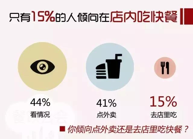 在所有餐飲業(yè)態(tài)中,快餐一定是被各大外賣平臺改造最為徹底的一個。在調查中,只有15%的人明確表示自己會去店里吃一頓快餐。只愿意點外賣的用戶占41%,剩下的44%的人會看情況決定是否要去店內吃還是叫外賣。 外賣對于快餐行業(yè)的影響不言而喻,經營得當?shù)目觳皖惿碳?,外賣流水可以占到50%甚至更高。外賣具備的打破空間限制的特性,也一定程度上弱化了商圈和店址對于快餐商家的重要性。