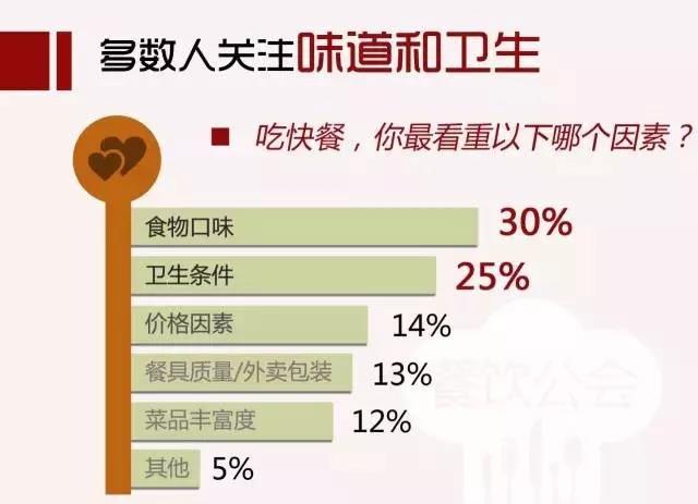 選擇快餐時最關注的因素中,30%的人選擇了口味,25%的人最注重的是衛(wèi)生條件,只有14%的人首先關注價格問題,這和關注餐具質量、外賣包裝這些視覺化體驗的人比例差不多。 另外,有12%的表示最喜歡“選擇多,經常出新品”的快餐。對于通過“單品打爆”的快餐店來說,在找準主營品類的同時,定期優(yōu)化和更新菜品也是不可避免的。