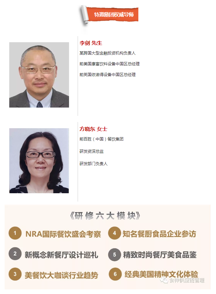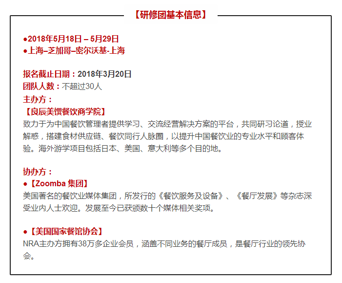 【良辰美饌餐飲商學(xué)院】重磅推出“中國(guó)餐飲精益管理美國(guó)高端研修團(tuán)”,現(xiàn)向餐飲業(yè)精英發(fā)出召集令------讓我們一同啟程探尋美國(guó)餐飲文化之風(fēng)采:展會(huì)調(diào)研、名企參訪、大咖交流、餐廳巡禮、跨界體驗(yàn)、美食品鑒...... 匯聚獨(dú)家高端資源,精彩不容錯(cuò)過(guò)!
