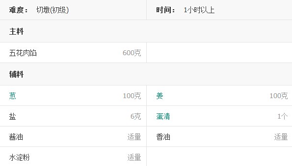 1. 準備食材。五花肉餡600g。蔥、姜切大片提前分別泡在一小碗水中。水淀粉少許,雞蛋清一個。