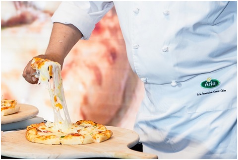 之后,曾苠先生隆重地介紹了Arla Pro今年即將推出的三款新品。Arla中國創(chuàng)新中心的創(chuàng)意總廚劉健先生也為來賓現(xiàn)場演示了新品Arla愛氏晨曦馬蘇里拉再制干酪絲卓越的拉絲性能,得到與會嘉賓的一致認(rèn)可。