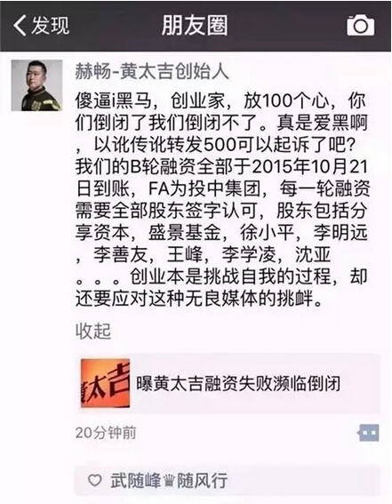 黃太吉前兩天被倆“傻逼”(赫暢語)黑了——《i黑馬》與《創(chuàng)業(yè)家》稱,據(jù)某投資人爆料,轉(zhuǎn)型做O2O外賣的黃太吉B輪融資沒到位,瀕臨倒閉。